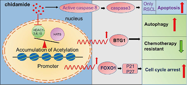 我们的研究发现西达本胺可以抑制利妥昔单抗/化疗耐药细胞株增殖并且诱导细胞周期阻滞在G0/G1期。西达本胺还可以抑制来自利妥昔单抗/化疗复发难治患者的原代B淋巴瘤细胞的增殖。耐药细胞株缺乏促凋亡蛋白,后续研究发现西达本胺通过激活自噬触发细胞死亡?;赗NA-seq和染色质免疫沉淀(ChIP)分析,我们确定BTG1和FOXO1为西达本胺靶基因,分别调控自噬和细胞周期。此外,西达本胺能够增加耐药细胞株对化疗药物顺铂的敏感性,西达本胺联合化疗药物顺铂显著降低了耐药细胞移植裸鼠淋巴瘤模型的肿瘤增殖。上述研究结果为进一步探索西达本胺在利妥昔单抗/化疗治疗后出现复发/难治性的B细胞淋巴瘤患者的治疗提供了理论基础。