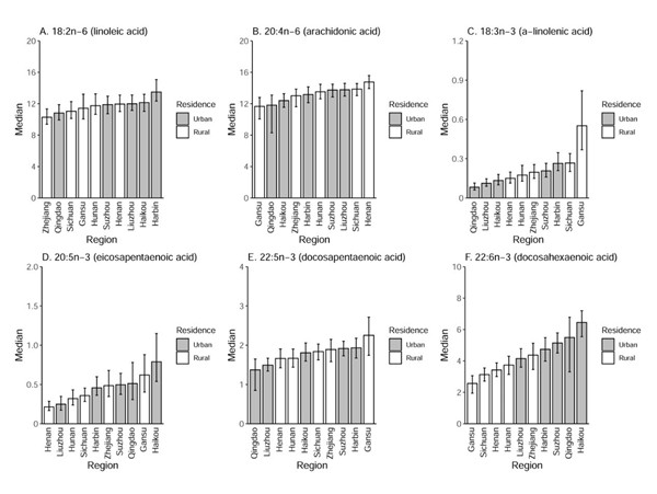 图1. 红细胞膜多不饱和脂肪酸水平的地区分布