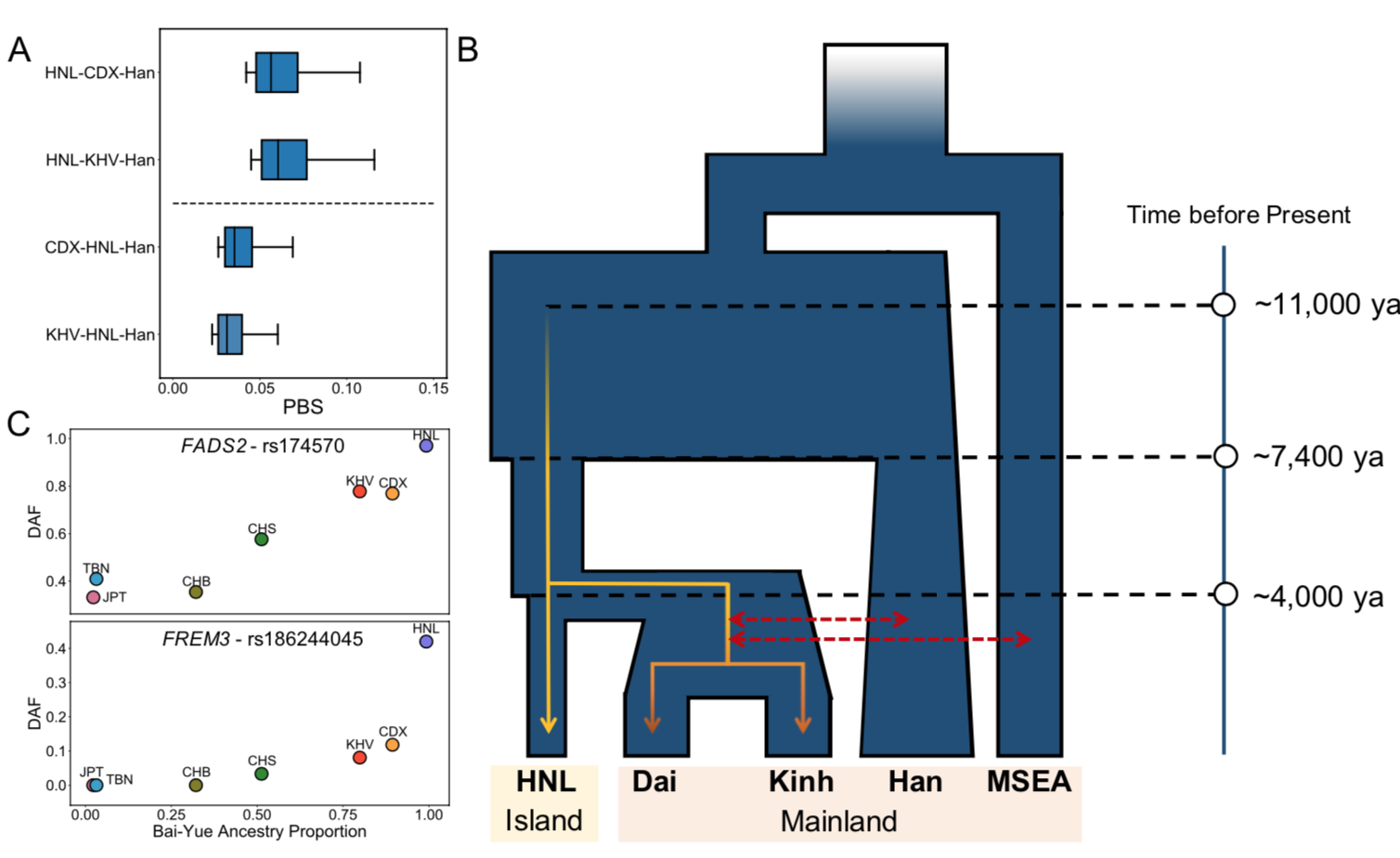 此外,研究团队还对海南黎族的适应性进化进行了探究。研究团队首先在海南黎族中鉴定出和多不饱和脂肪酸代谢相关的FADS1和FADS2中存在选择信号,并发现该信号在东亚南北方地区存在差异,且在黎族中衍生等位基因的频率最高(图3)。同时,研究团队还发现海南黎族存在多个与疟疾相关的基因(如CR1)以及与B细胞淋巴瘤等血液疾病相关的基因(如CD3G)上发生的适应性选择信号,且海南黎族的适应性选择信号显著富集到与造血功能相关的通路中。这很可能是因为位于热带地区的海南岛上过去的疟疾发病率较高,位于岛上的黎族先民在疟疾的选择压力下而产生了一系列与血液疾病相关的权衡。最后,研究团队还结合百越族群的群体历史和适应性进化特征,构建了百越族群的遗传演化模型(图3)。