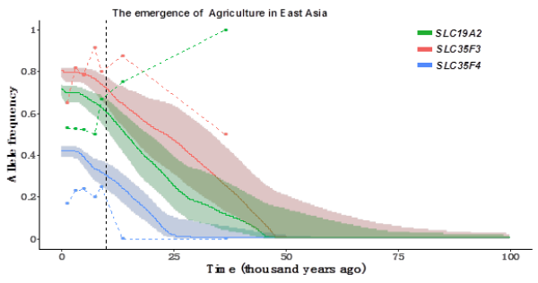 维生素B1的一个重要功能是促进碳水化合物的代谢。为了验证在东亚地区农业发生后人群饮食结构的改变是否是这种适应性选择的进化驱动力。该研究通过分析当代人群的基因组数据,并结合不同历史时期古现代人基因组数据去估计受选择单倍型在不同历史时期的频率。结果发现受到选择的单倍型在1万年前已达到了高频,而在近1万年内频率未发生大的改变(图2)。该分析结果进一步表明适应性进化在1万年前已经完成。这可能也提示农业发生后人群饮食结构的改变并非自然选择的原初驱动力。