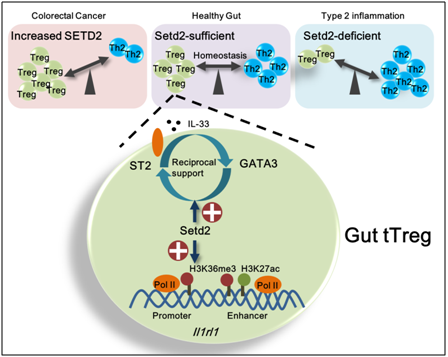 ????????????????  图. Setd2通过调控启动子和基因内增强子的活性来调控肠道tTreg细胞中靶基因(包括Il1rl1)的表达,同时影响肠道Treg细胞的稳态,抑制肠道Th2反应。