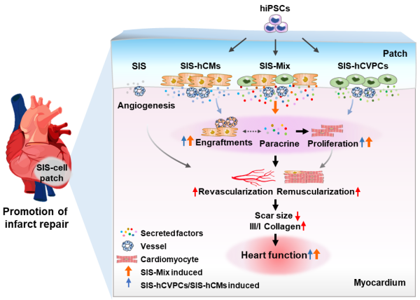 心肌梗死(心梗, MI)死亡是疾病致死的主要原因,其死亡率在我国呈逐年上升趋势,严重危害国人健康。心梗后大量死亡的心肌细胞被纤维瘢痕替代,进而导致心力衰竭。现有治疗方法难以逆转心梗后心肌细胞大量死亡和纤维瘢痕形成导致的心力衰竭,因此,亟需发展改善心肌细胞减容、促进梗死心脏组织和功能重建的方法?;趆PSCs衍生心血管细胞的移植治疗的探索显示了其应用前景。杨黄恬研究组和其他研究团队的工作证实hCVPCs和hCMs移植到小鼠、猪及非人灵长类动物梗死心脏中可显著改善心功能,减少纤维化,但仍面临hCVPCs驻留率低、心肌内注射hCMs发生室性心律失常等难题。因此,如何提高移植细胞驻留、疗效与安全性,明确适宜的移植细胞类型和作用机制对细胞治疗走向临床至关重要。脱细胞猪小肠粘膜下层细胞外基质材料(SIS)具有优越的生物相容性,支持干细胞附着和生长,在心梗后移植可促进血管生成和心功能恢复,但尚不清楚其是否可用于构建hPSCs衍生心血管细胞的补片。