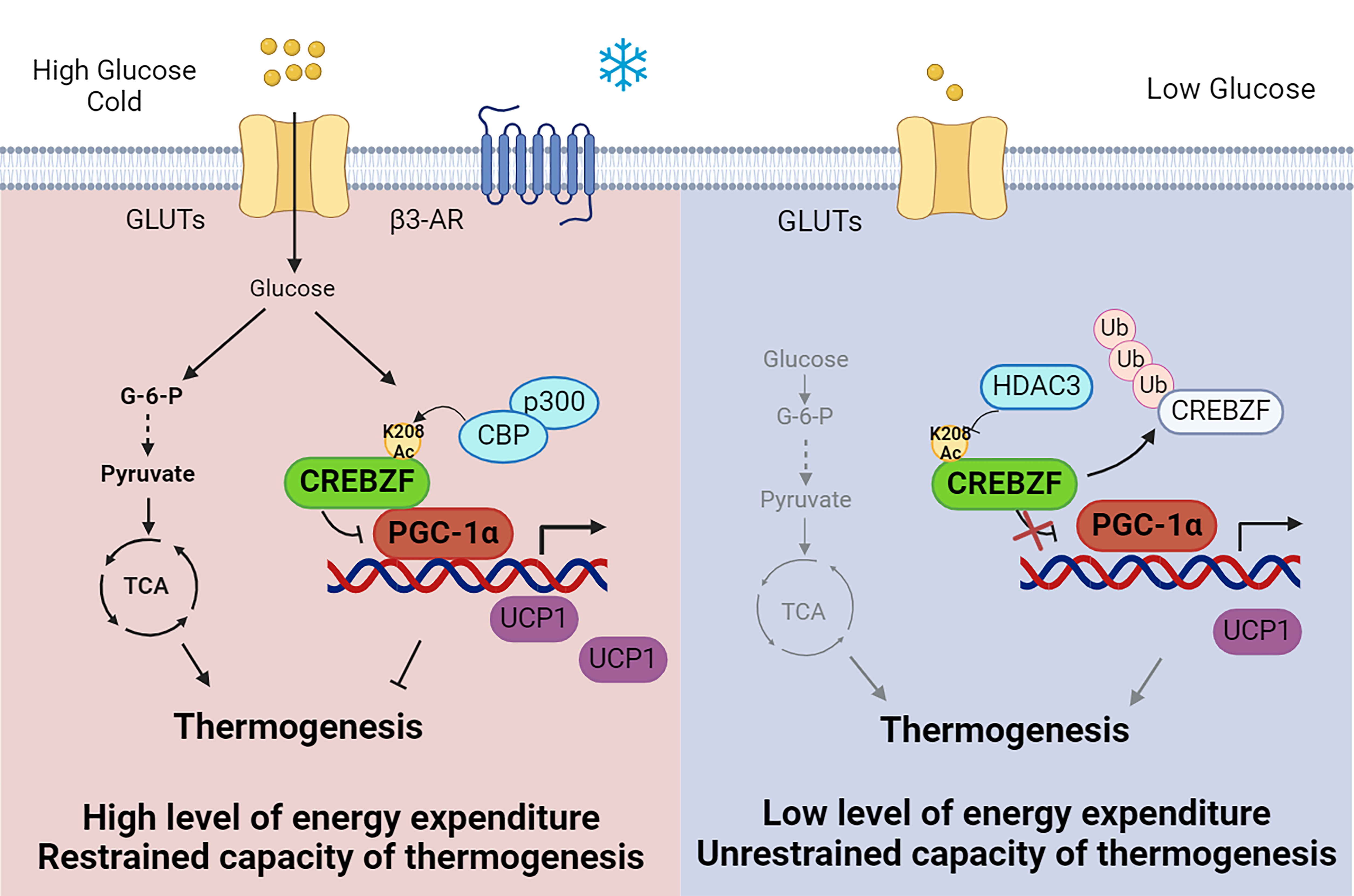(在低温及环境信号刺激时,脂肪细胞将大量摄取葡萄糖,一方面可作为供能物质直接为脂肪细胞提供能量,另一方面,葡萄糖信号通过CBP/p300增加CREBZF乙?;奘渭暗鞍孜榷ㄐ?,CREBZF将与PGC-1α结合抑制产热相关基因表达,限制脂肪细胞对能量过度消耗。本研究表明CREBZF是感知葡萄糖信号通路中的关键因子,CREBZF对葡萄糖感应的失调,在能量过剩造成的肥胖及相关代谢疾病发生发展中发挥重要作用)