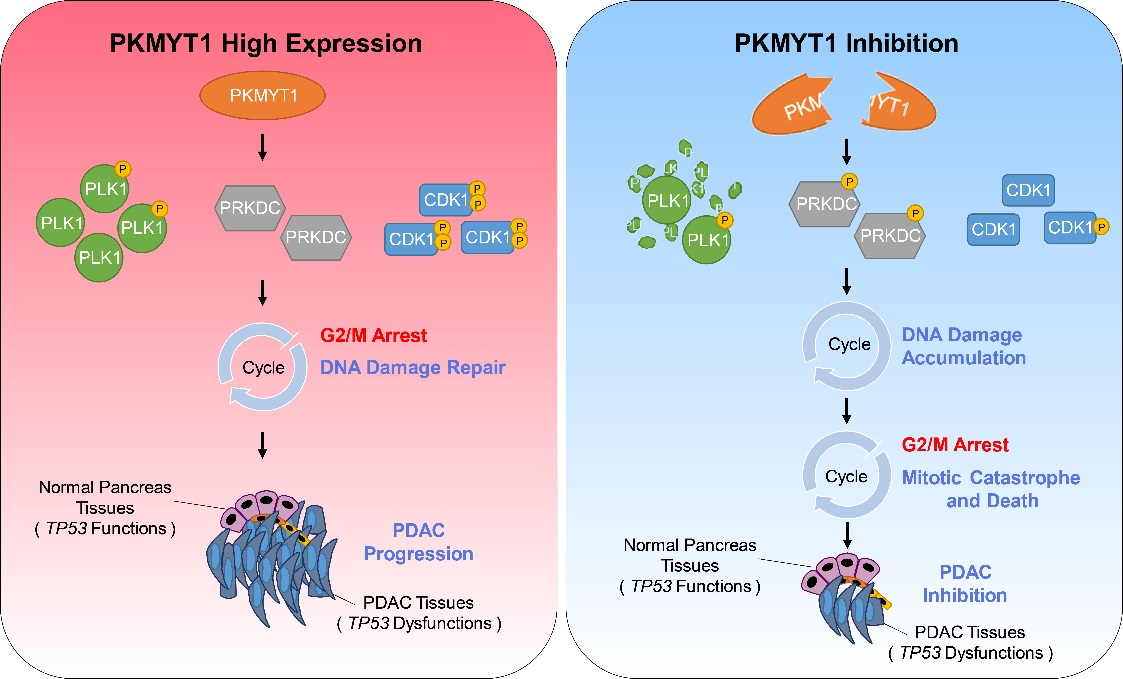 (左):PKMYT1高表达,G2/M期可进行DNA损伤修复,癌细胞持续增殖。(右):PKMYT1抑制,下游信号改变(PLK1、CDK1、PRKDC等),G2/M检验点功能异常,癌细胞积累大量DNA损伤,导致凋亡。靶向PKMYT1是集有效性和安全性于一体的胰腺癌治疗策略