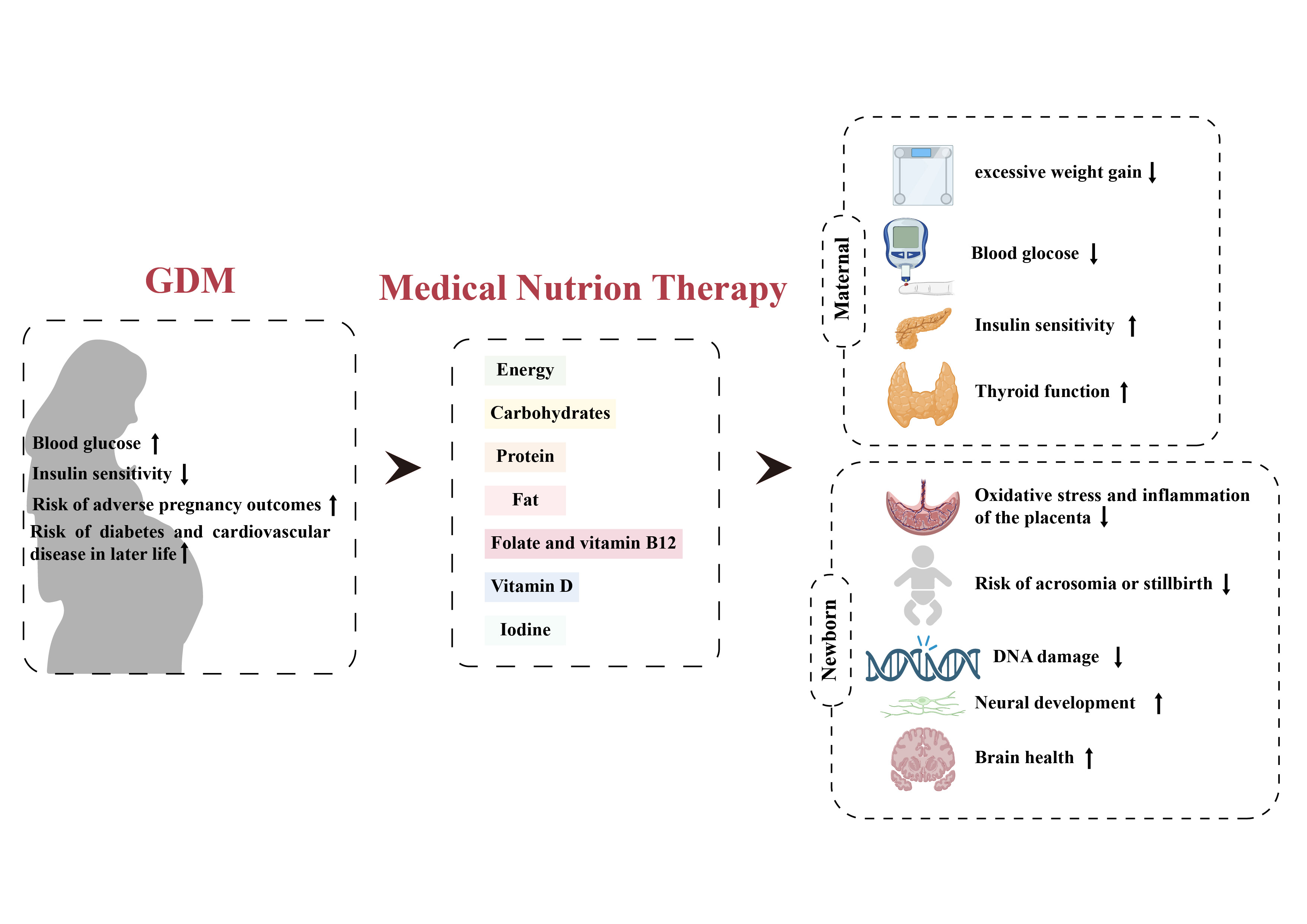 (注:妊娠期糖尿病期间使用医学营养治疗对孕产妇的血糖维持、妊娠结局和胎儿生长发育的积极作用)