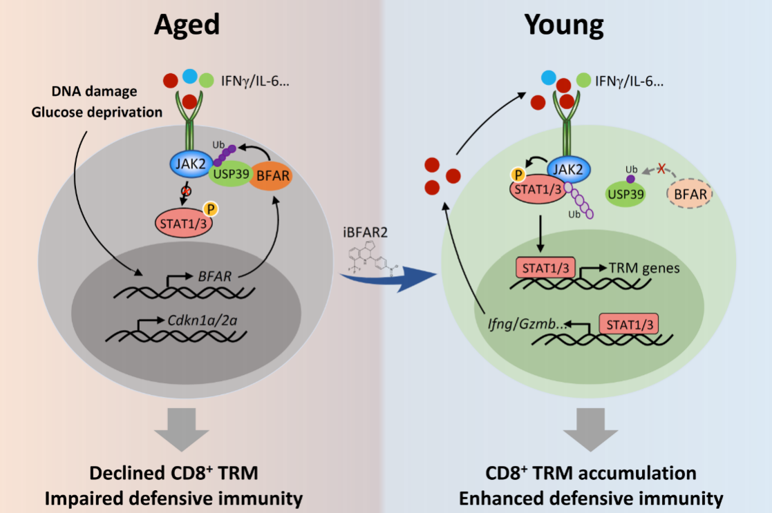 为了进一步探究衰老导致TRM分化受到抑制的分子机制,通过多因素基因筛选发现,在老年个体来源CD8+?T细胞中,E3泛素连接酶BFAR的高表达会抑制TRM细胞的产生;在机制方面,E3泛素连接酶BFAR可通过直接介导去泛素化酶USP39的泛素化并使其活化,进而促进USP39对JAK2的去泛素化,从而抑制了细胞因子诱导的JAK-STAT信号通路的激活,最终导致TRM的分化的降低及其介导的机体抗肿瘤免疫反应的缺陷。特异性在CD8+?T细胞中敲除BFAR基因则显著促进了其在肿瘤微环境中向TRM的分化,进而增强了其抗肿瘤的免疫功能。