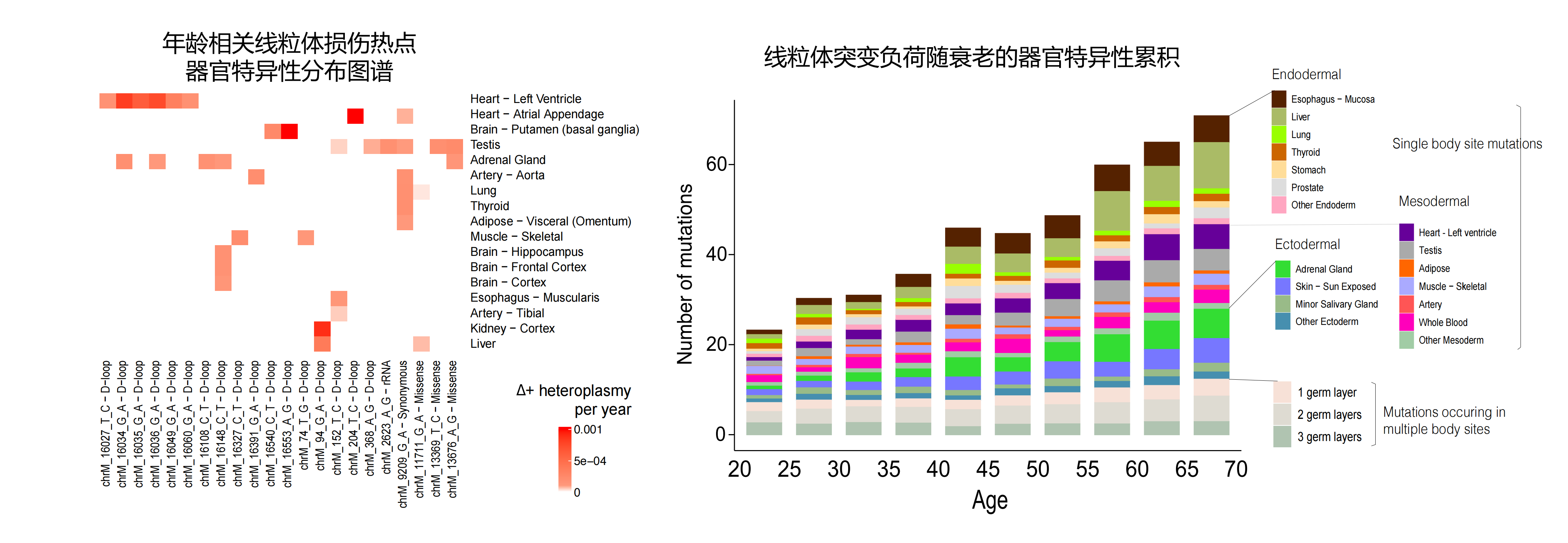 线粒体被认为是远古细菌与真核细胞共生演化的产物,它们拥有独立的基因组,是细胞的能量工厂。然而,线粒体基因组在生命过程中不断积累突变,其突变率远高于细胞核DNA,这些突变可能与衰老和疾病密切相关。李昕团队利用罕见变异识别技术,对来自国际公开数据库中超万例的线粒体转录组低频变异数据进行深度提?。ㄊ堇醋越?0到70岁健康个体的47种不同器官组织),首次系统性绘制了人体组织特异性的线粒体突变图谱,揭示了线粒体突变随年龄增长而积累的“双相”时钟规律。