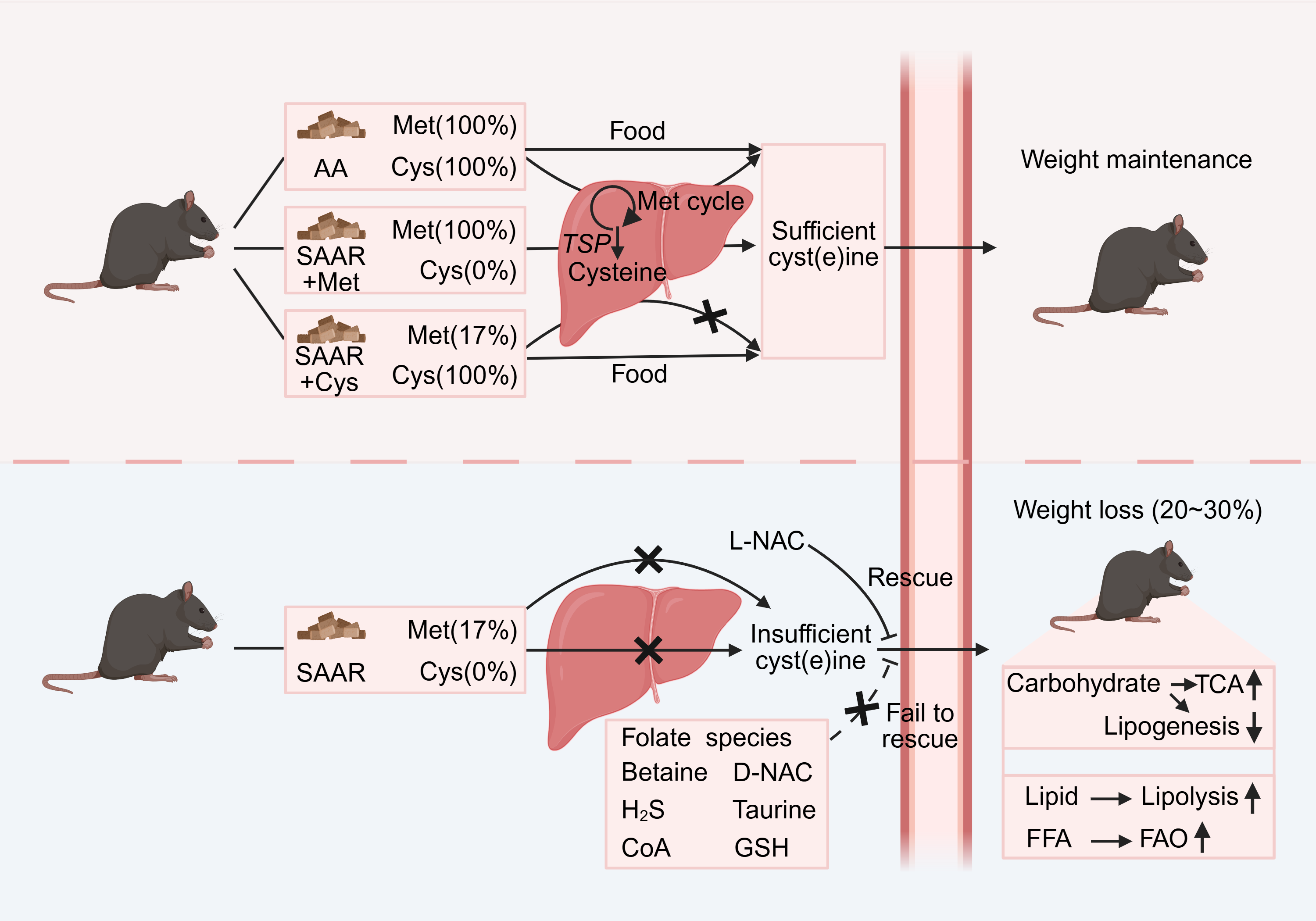 肥胖是诱发代谢综合征的重要危险因素,目前的临床干预手段如药物治疗、减重手术及生活方式管理可取得显著成效,但其高昂费用、术后安全性、长期依赖及停药后反弹等问题,也引发公众相关困扰。近年来广泛研究的饮食干预策略,如间歇性禁食(IF)、生酮饮食(KDs)及特定营养素限制,已被证实通过增强代谢信号,促进脂肪氧化等方式对体重控制有效。然而,长期禁食引发的情绪低落、认知障碍、毛囊干细胞死亡以及长期高脂肪摄入引发的血脂、胃肠道异常等问题都难以避免。在限制特定营养素摄入的方法中,饮食氨基酸限制已被证实是一种强有效的抗肥胖策略。限制支链氨基酸(BCAAs)的摄入量,可通过抑制mTORC1活性、促进线粒体呼吸,从而增加能量消耗。但因BCAAs在肌肉蛋白质合成中的重要性,其摄入限制在不同人群中的安全性和适用性仍有待考量。SAAs也因其在慢病进展中的多方面作用,近年来备受关注。甲硫氨酸限制被发现在不同物种中均与寿命延长、胰岛素敏感性增强及氧化应激减少相关,(半)胱氨酸则在氧化还原稳态及铁死亡(ferroptosis)等领域,尤其是肿瘤学中被广泛研究。然而,甲硫氨酸与(半)胱氨酸的单独及联合作用对减重的调控机制仍不清楚。