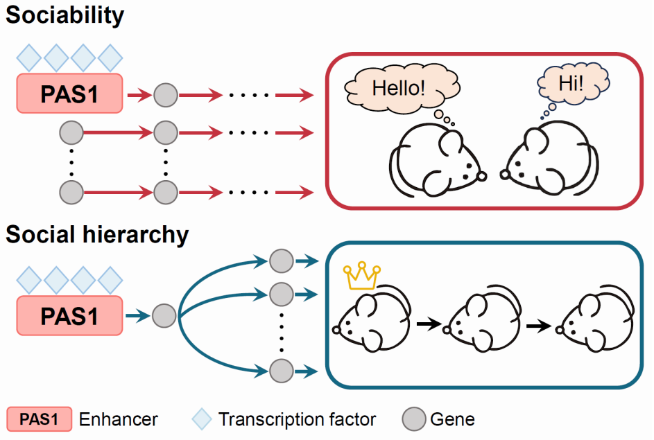 图:PAS1增强子对社交能力与社会分化的遗传调控机制示意图