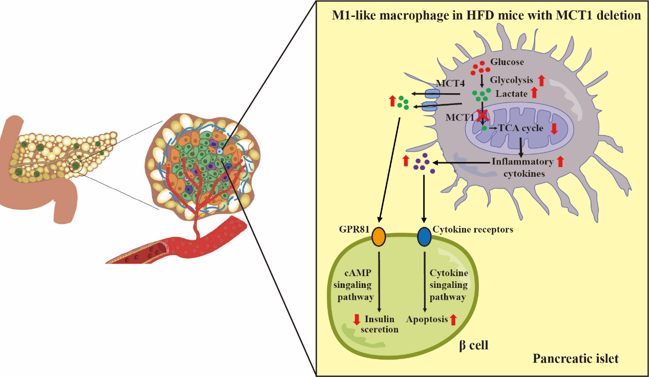 肥胖是21世纪最严峻的公共卫生挑战之一,也是糖尿病的重要诱因。 肥胖诱导的慢性低度炎症重塑胰岛免疫微环境,导致巨噬细胞异?;罨?,直接或间接损害胰岛β细胞功能。作为先天免疫的核心效应细胞,巨噬细胞通过其表型极化、炎性因子分泌及免疫互作网络,参与了胰岛损伤和糖尿病进程。多项研究表明,相较于非糖尿病人群,1型和2型糖尿病患者均表现出基础血乳酸水平升高。值得注意的是,在2型糖尿病肥胖受试者中观察到的血浆乳酸浓度,显著高于非肥胖、非糖尿病的对照组个体。此外,糖耐量受损个体的血乳酸水平也显著高于糖耐量正常者。然而,基础血乳酸浓度的升高,是否是导致糖尿病的发病机制,尚不明确。