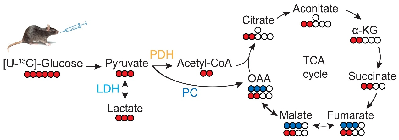 图:口服[U-13C]葡萄糖后雌雄小鼠外周血中 13C 标记的糖酵解和 TCA 循环代谢物分析示意图