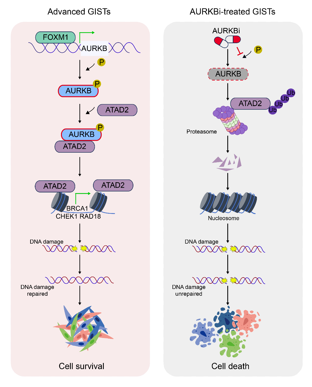 营养与健康所博士研究生程裕梅在王跃祥研究员指导下,通过早期/晚期GIST多组学筛选、CRISPR筛选和高通量化合物筛选三重整合筛选,鉴定出AURKB为不依赖于KIT突变类型的GIST新型治疗靶点。发现AURKB在高危及转移性GIST中显著高表达,而在低中危肿瘤中几乎不表达,这种表达上调由转录因子FOXM1直接调控。AURKB基因敲除显著抑制了肿瘤细胞在体外和小鼠体内的生长,并诱发细胞周期阻滞、衰老和凋亡。机制研究表明,AURKB通过自身激酶结构域与ATAD2结合,稳定了ATAD2蛋白避免其被多聚泛素化标记降解。被稳定的ATAD2蛋白通过调控与DNA损伤修复相关基因区域的染色质开放性调节基因表达,增加肿瘤细胞抵抗DNA损伤并稳定基因组的能力,进而发挥促癌作用。