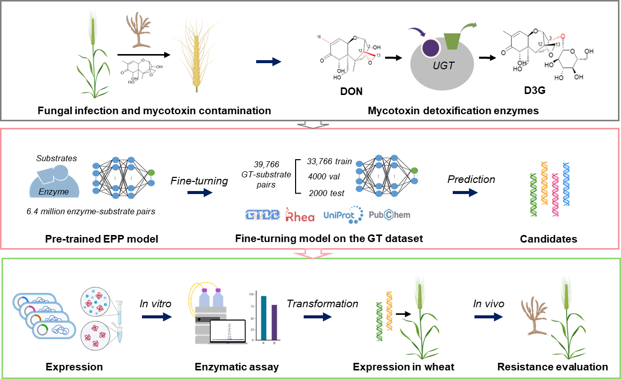 研究团队开发了专门用于糖基转移酶(GTs)底物杂泛性预测的深度学习模型EPP-GT,该模型整合了来自GTDB、Rhea和RxnFinder等多个数据库的酶-底物配对数据,采用图神经网络结合注意力机制的计算模拟方法,实现对糖基转移酶催化功能的高效预测。通过前期模型预测和实验验证,成功挖掘出具有DON降解能力的新型UGTs,其物种来源分别为酸枣(Ziziphus jujuba)和野生稻(Oryza meyeriana)。体外催化实验表明这两种酶能将DON转化为低毒性的D3G,转基因小麦相关实验进一步证实,表达新型UGTs的小麦品系表现出对DON和禾谷镰刀菌感染的显著抗性,病害症状减轻,毒素积累减少。