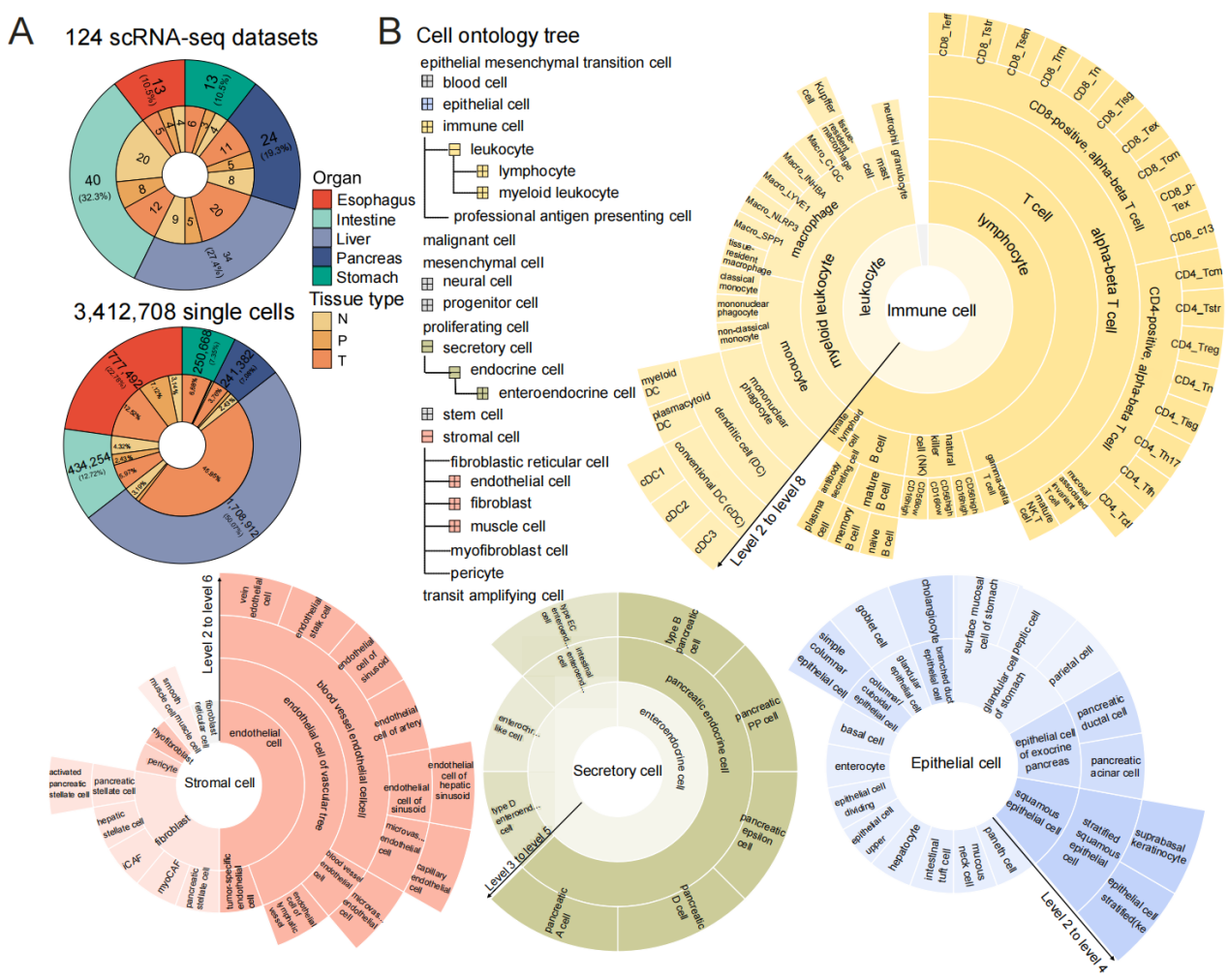图1:PreDigs数据概况。A)PreDigs数据库包含124个经过专门处理的单细胞RNA测序数据集,涵盖142种细胞类型,总共涉及约340万个细胞,来源于5种消化器官和3种组织类型。饼图分别展示了不同消化器官(上图)及不同组织类型(下图)中数据集和单细胞的分布情况。B)细胞本体树结构示意图,共包含8个层级。该层次结构中所使用的细胞类型名称均遵循细胞本体数据库(Cell Ontology)提供的标准化命名及格式规范。