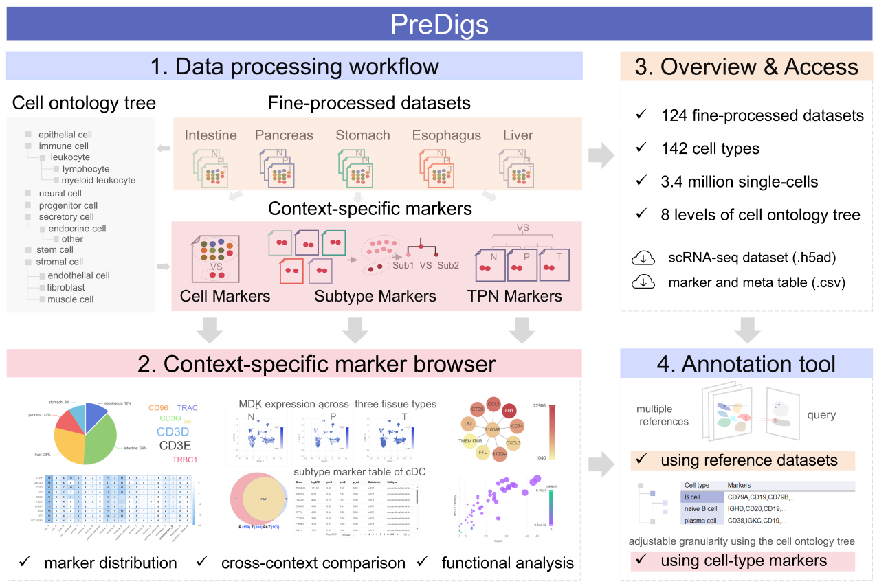 消化道癌症是全球健康的主要威胁,其肿瘤微环境(Tumor Microenvironment, TME)具有高度异质性,亟需精准的单细胞图谱进行解析。然而现有的细胞标志物数据库普遍缺乏细胞类型的标准化工序、跨组织比对功能以及针对TME复杂性的深度注释信息。PreDigs的建立有效填补了这一空白。