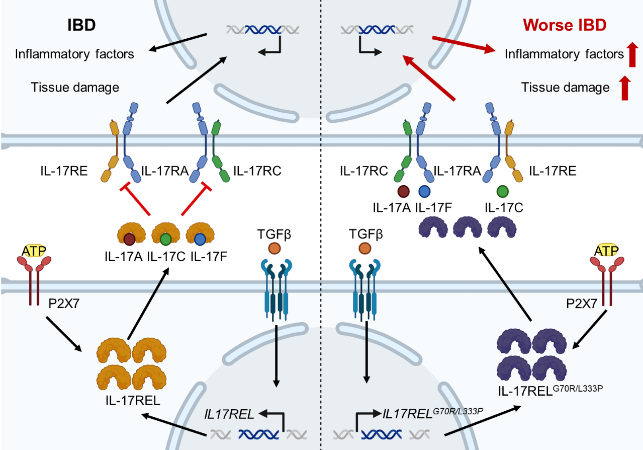 研究团队长期从事IL-17家族细胞因子及其受体的研究,取得一系列研究成果(Nat. Immunol.?2011; Nat. Med.?2012; Immunity?2014, 2015, 2019)。本研究首次鉴定并系统阐明了IL-17家族的诱饵受体IL-17REL,解析了其表达调控机制及免疫功能,并明确其功能性突变是IBD的重要遗传致病因素之一。这一发现不仅为深入理解IBD的发病机制提供了新的理论框架,也为开发靶向IL-17信号通路的创新治疗策略提供了全新的潜在靶点。