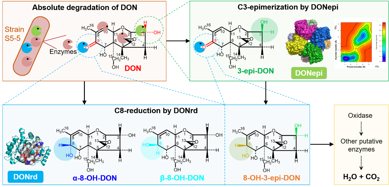 该研究不仅揭示了DON毒素的完全降解路径,破解了传统技术“降解不彻底”的难题,更通过结构生物学与分子模拟的深度结合,揭示了醛酮还原酶家族的新型催化机制,为后期工程化创制多酶协同降解系统、酶制剂产业化应用以及抗毒素生物育种打下了良好基础。