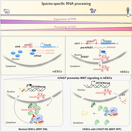 在这项研究中,科研人员基于细胞核和细胞质分离的人、鼠胚胎干细胞来源的高通量测序数据,针对序列及基因组位置保守的一类长非编码RNA进行了加工及亚细胞定位分析,发现人胚胎干细胞中长非编码RNA更多地定位于细胞质,而小鼠胚胎干细胞中长非编码RNA则更多地滞留于细胞核。实验上进一步证明了人、鼠不同亚细胞定位的长非编码RNA具有不同功能并详细解析了其中一个新型的长非编码RNA——hFAST维持人胚胎干细胞自我更新的分子机制。为了进一步探究长非编码RNA在不同物种间加工定位差异的分子机制,研究人员结合生物信息学分析预测和实验验证筛选到了调控它们不同定位的关键因子PPIE。分析发现在鼠、猴、人胚胎干细胞中PPIE表达成下降趋势,而长非编码RNA加工水平则成上升趋势,且长非编码RNA在人胚胎干细胞中更加倾向定位在细胞质中。深入实验分析进一步证明了PPIE蛋白对长非编码RNA(包括FAST)的剪接加工及亚细胞定位的调控作用。上述研究首次揭示了非保守的RNA加工和定位对长非编码RNA功能发挥的重要作用,从而提示长非编码RNA的姿态万千可能是物种特异性的调控和适应的一个重要机理,为物种差异长非编码RNA的研究提供了新基础和新思路。