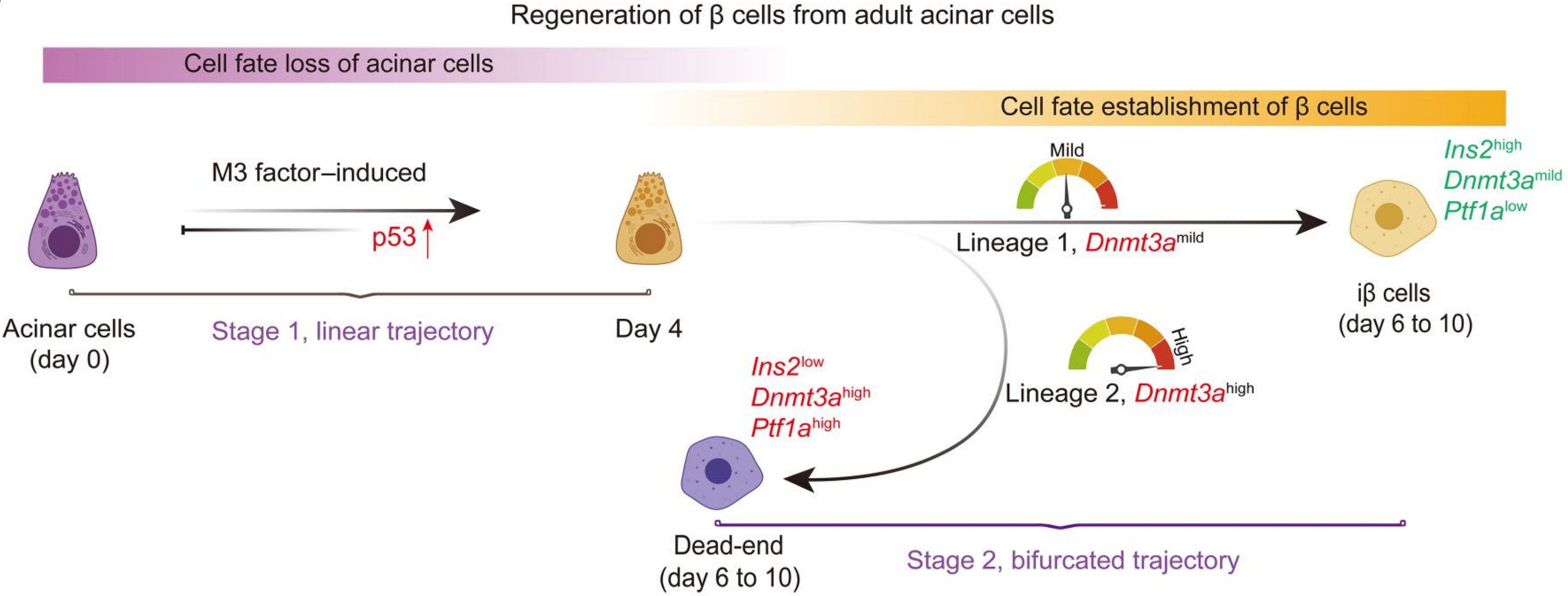 图注:该图描述了M3因子体内诱导腺泡细胞向 细胞转分化过程中阻碍因子的工作机制设想。p53在阶段一短暂地上调,作为重编程阻碍因子发挥作用。而Dnmt3a在阶段二的异质性表达可能导致细胞命运发生改变:Dnmt3a的适度表达使细胞重编程成功,最终转化为 细胞;Dnmt3a的高表达导致细胞重编程失败,细胞最终呈现的分子特征包括:Ptf1a(腺泡细胞标记基因)、Dnmt3a高表达,Ins2( 细胞标记基因)低表达。