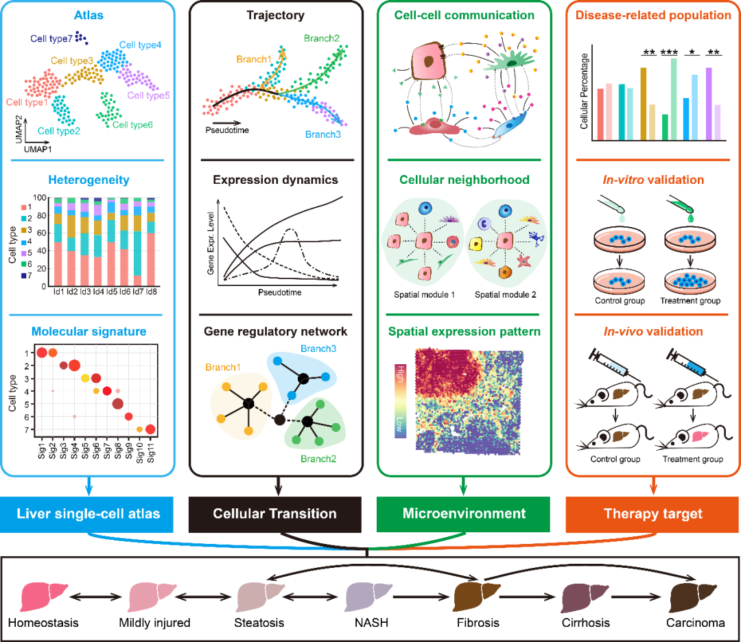 图1、单细胞以及空间组学技术在肝脏研究中的常见应用场景及总体分析思路