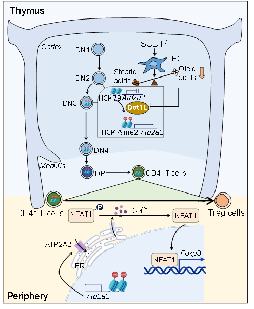 硬脂酰辅酶A去饱和酶(stearoyl CoA desaturase, SCD)是催化来源于食物或者从头合成的饱和脂肪酸转变为单不饱和脂肪酸(油酸与棕榈油酸)的限速酶。其中,人类基因组中的2个SCD基因均与小鼠SCD1基因高度同源。研究发现,SCD1缺失显著促进小鼠外周血、淋巴结以及主要组织器官中Foxp3+ Treg的数量与比例,并赋予其抵抗自身免疫性疾病的能力,这一现象与SCD1缺失促进初始CD4+ T细胞向Treg分化密切相关。利用条件性敲除小鼠、骨髓移植、胸腺移植和T细胞体外发育等体系,研究揭示SCD1在胸腺上皮细胞中的缺失是导致初始CD4+ T细胞向Treg的分化倾向性增加的主要原因,而非SCD1在T细胞中缺失所引起。更为重要的是,胸腺上皮细胞油酸的可利用性影响初始CD4+ T细胞向Treg分化潜能的关键窗口期是胸腺细胞DN2向DN3的发育阶段。在油酸缺乏的胸腺微环境中,胸腺细胞内表观遗传修饰酶DOT1L活性上调,借以H3K79me2修饰促进DN3胸腺细胞中Atp2a2基因座的染色质开放水平。这一表观遗传学印记从DN3阶段一直保留至初始CD4+ T细胞,使其在接受T细胞受体激活信号时,通过ATP2A2——calcium——NFAT——Foxp3信号轴促进其向Treg分化。该项研究首次揭示胸腺基质微环境中的油酸信号影响和预编程外周T细胞亚群分化偏好性的细胞与分子机制,不仅为理解不同生理病理环境中T细胞免疫调控机制提供了新视角,也为Treg的定向高效诱导及其在器官移植、自身免疫性疾病等治疗中的应用提供新策略与新方向。
