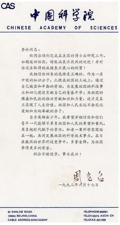 回国是李林做的第二个重要决定,这个决定成就了今天的他。1992年,李林刚过而立之年。从美国纽约州立大学石溪分校以优异的科研成果完成博士后工作,李林谢绝了美国相关研究所的邀请,回到上海生化所,这一举动被传为佳话。当时的中科院院长周光召特地给这位首届院长奖学金特别奖的获得者写来了一封热情洋溢的信,这封信李林至今还保存着:“我相信你回来的选择是正确的。作为一名中国的知识分子,扎根在祖国的土地上,通过自己的诚实和辛勤的劳动,为发展祖国的科技事业和四化建设贡献自己的青春年华;为祖国的强盛和民族的振兴贡献知识和力量,这才是真正实现了人生价值。祖国和人民永远不会忘记爱她和为她奉献的赤子?!?/p>