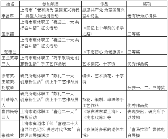 研究所党委委员、人事教育处负责人陈建红为获奖老同志颁发了荣誉证书,向大家表示祝贺?;窠贝碚胖衫?、王毓美发表感言,感谢研究所为老同志“展示退休生活的绚丽多彩,抒发爱党爱国的真挚情感”所搭建的平台,并表示将再接再厉,主动作为,为研究所的发展贡献更多的银发智慧。