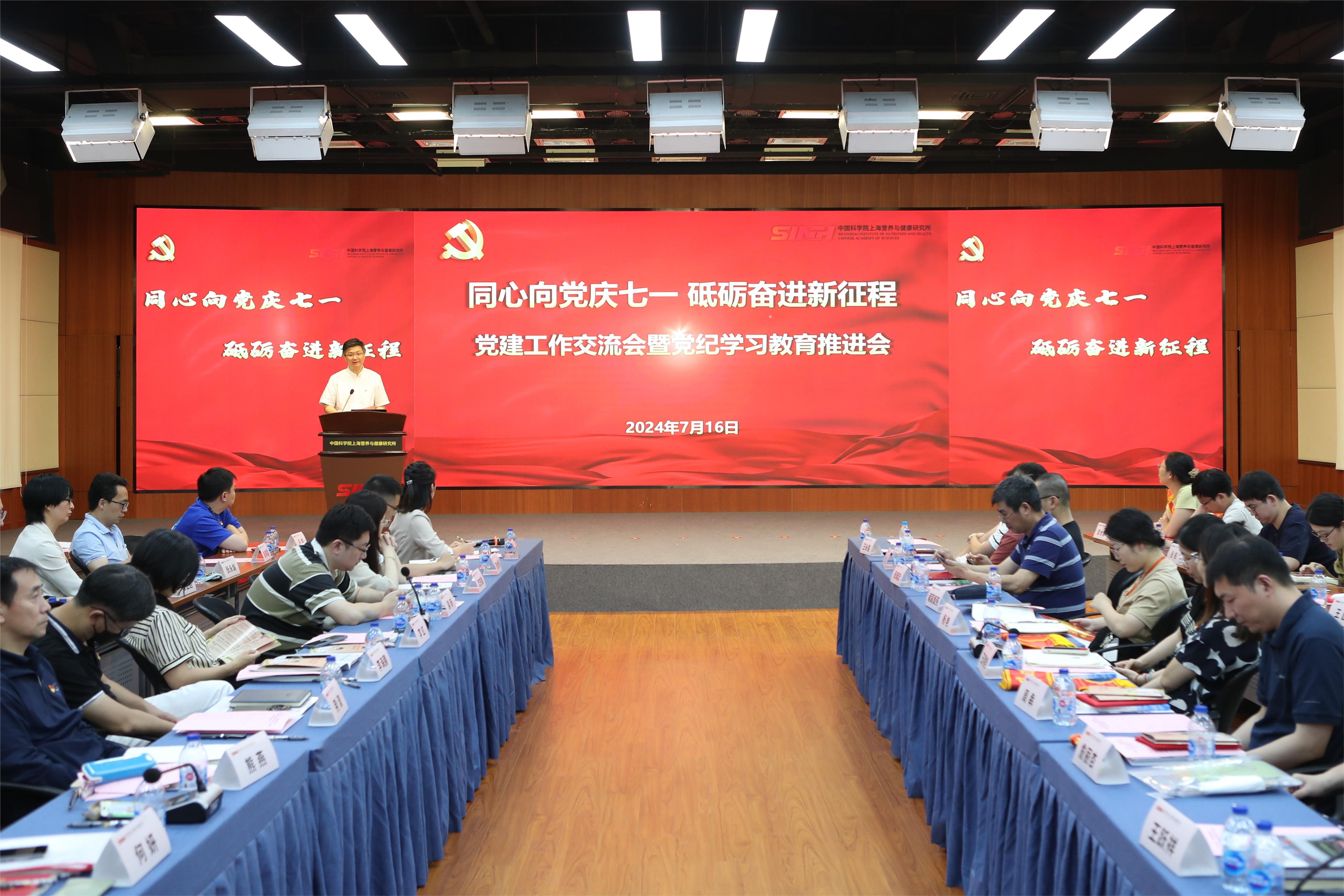 7月16日下午,为庆祝中国共产党建党103周年,深入学习贯彻习近平新时代中国特色社会主义思想,认真落实好党建工作主体责任,扎实推进党纪学习教育,中国科学院上海营养与健康研究所党委组织召开“同心向党庆七一·砥砺奋进新征程”党建工作交流会暨党纪学习教育推进会。中国科学院上海分院党建督导组组长郏静芳、党建工作处(纪检办公室)薛芳应邀出席会议。营养与健康所党委书记瞿荣辉、纪委书记曹永以及研究所“两委”委员、受表彰人员、基层党组织负责人等70余人参加会议?;嵋橛刹苡乐鞒?。