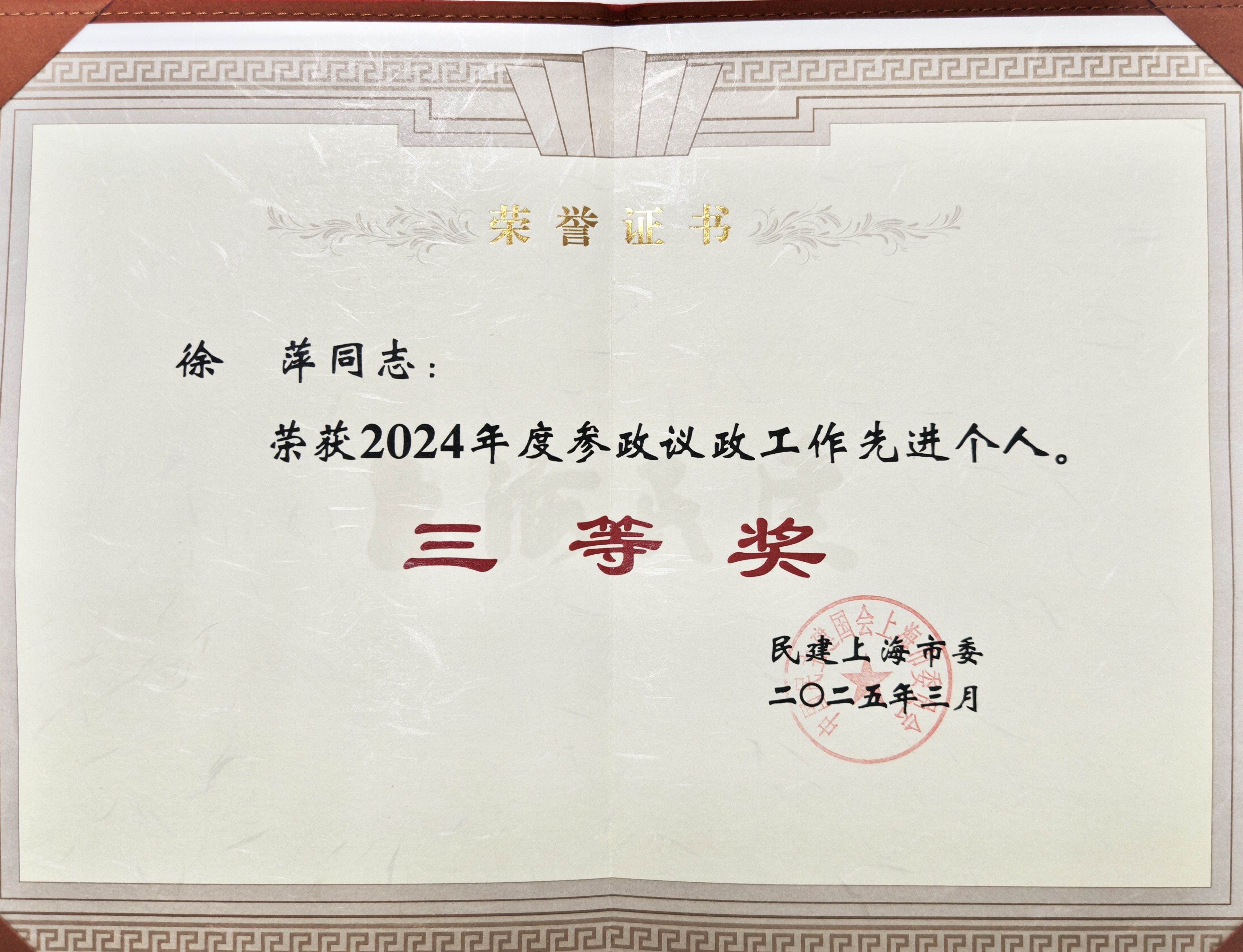 徐萍已连续多次获得民建上海市委参政议政工作先进个人表彰,并在2024年获得民建中央“民建组织建设工作先进个人”称号。其撰写的社情民意等多次被列入民建市委两会期间的组织提案,其撰写的社情民意信息被选作市政协民建界别提案。