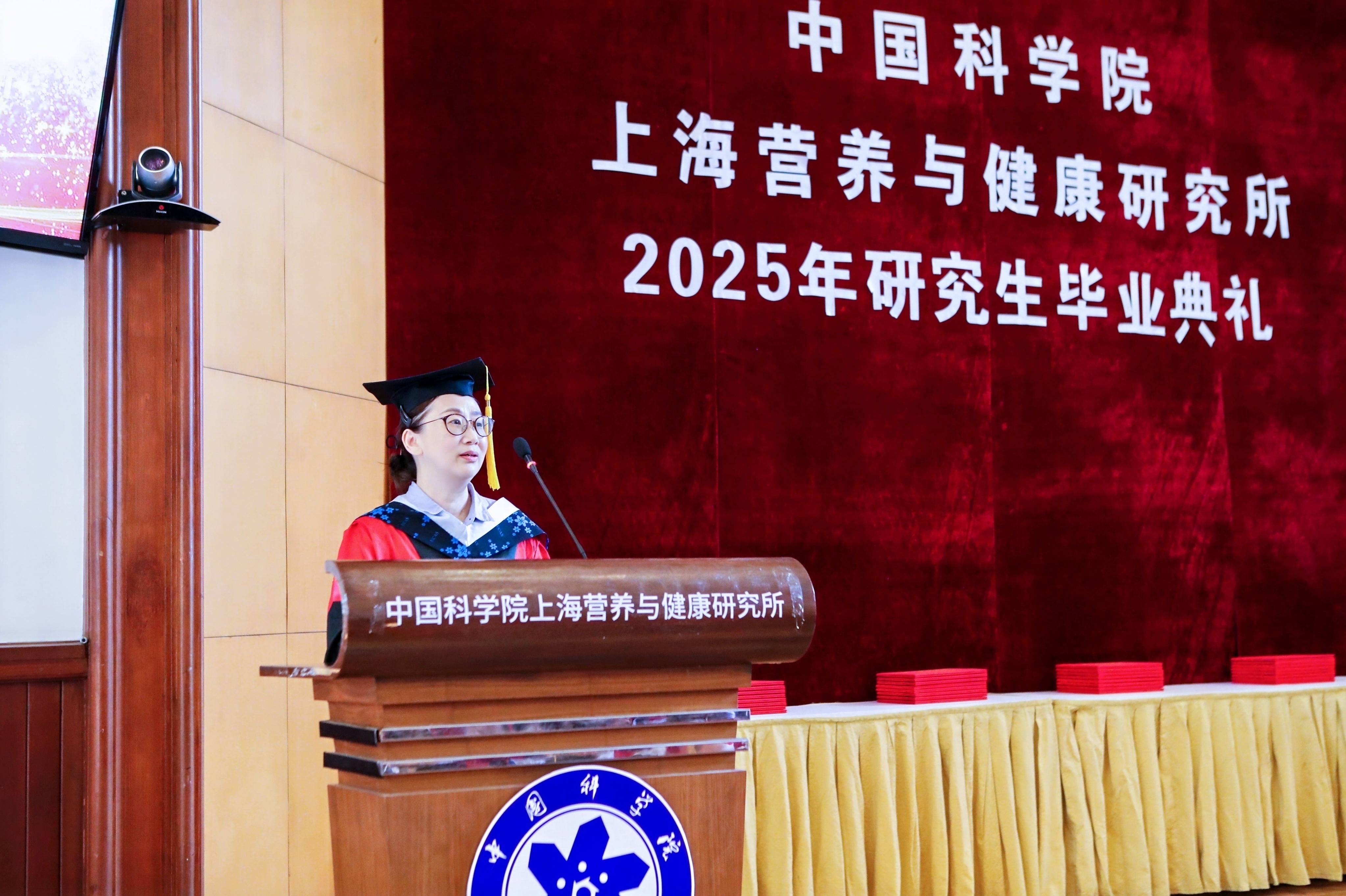 6月20日,中国科学院上海营养与健康研究所2025年研究生毕业典礼在生科大楼报告厅举行。营养与健康所所长、党委副书记汪思佳,副所长、学位评定委员会主席胡国宏,所务委员、学位评定委员会副主席邵振,学位评定委员会委员孔祥银、王跃祥,导师代表熊燕、黄涛、王振,2025届毕业生与毕业生亲友、研究生处教育管理干部等100余人齐聚一堂,共同参与了这一盛典。毕业典礼由邵振主持。