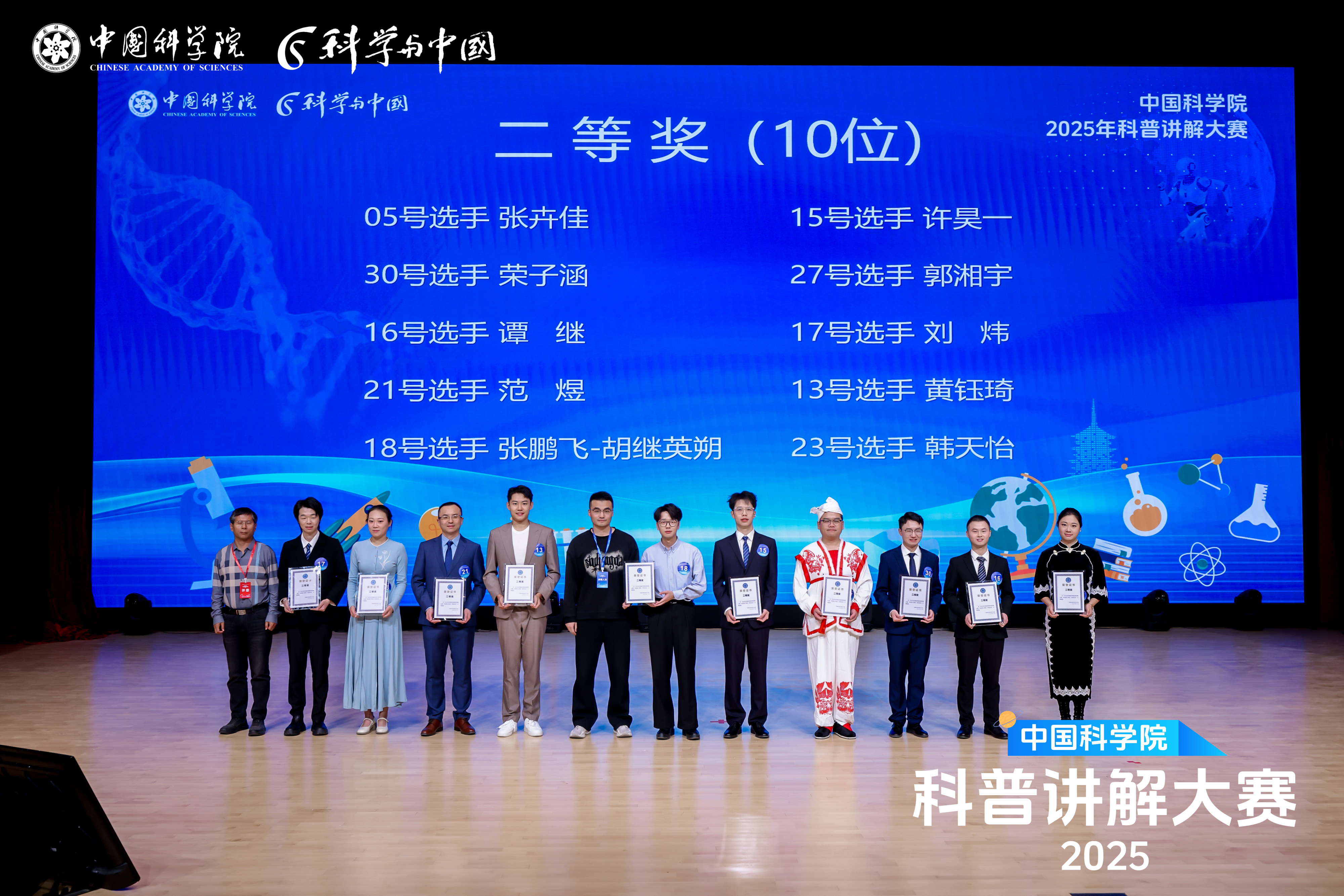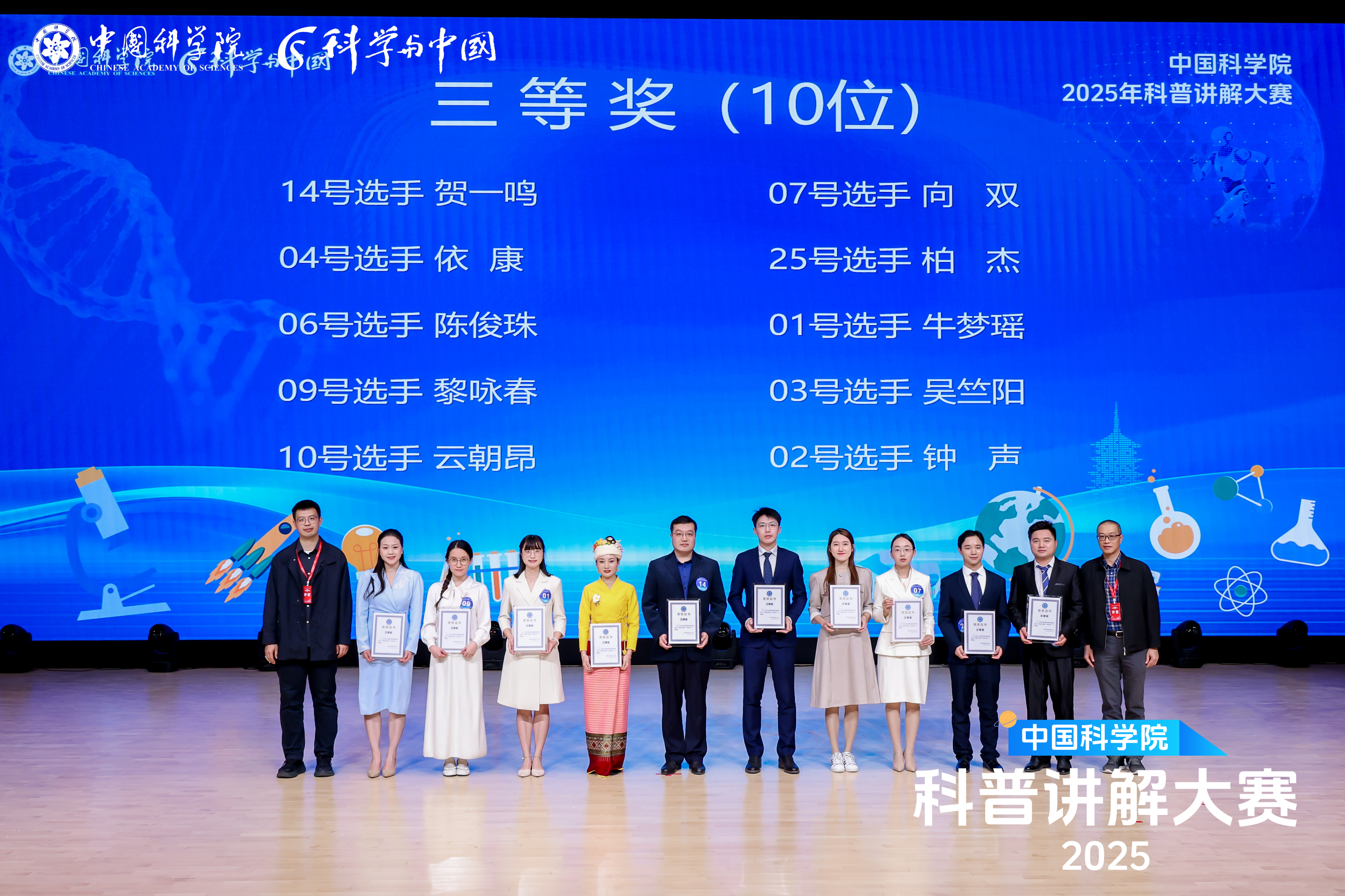 中国科学院上海营养与健康研究所经过前期面向所内广泛征集、精心组织筹备培训,选拔出黄钰琦(马昊研究组研究生)、吴竺阳(章海兵研究组研究生)、李学良(李虹研究组研究生)三位选手代表参赛。选手们化身前沿基础与应用基础研究的“翻译官”,让“高大上”的科学知识“接地气”,从半决赛与总决赛的激烈角逐中脱颖而出。其中,黄钰琦荣获大赛二等奖,吴竺阳荣获三等奖,李学良荣获优秀奖。营养与健康所同时获评优秀组织奖。