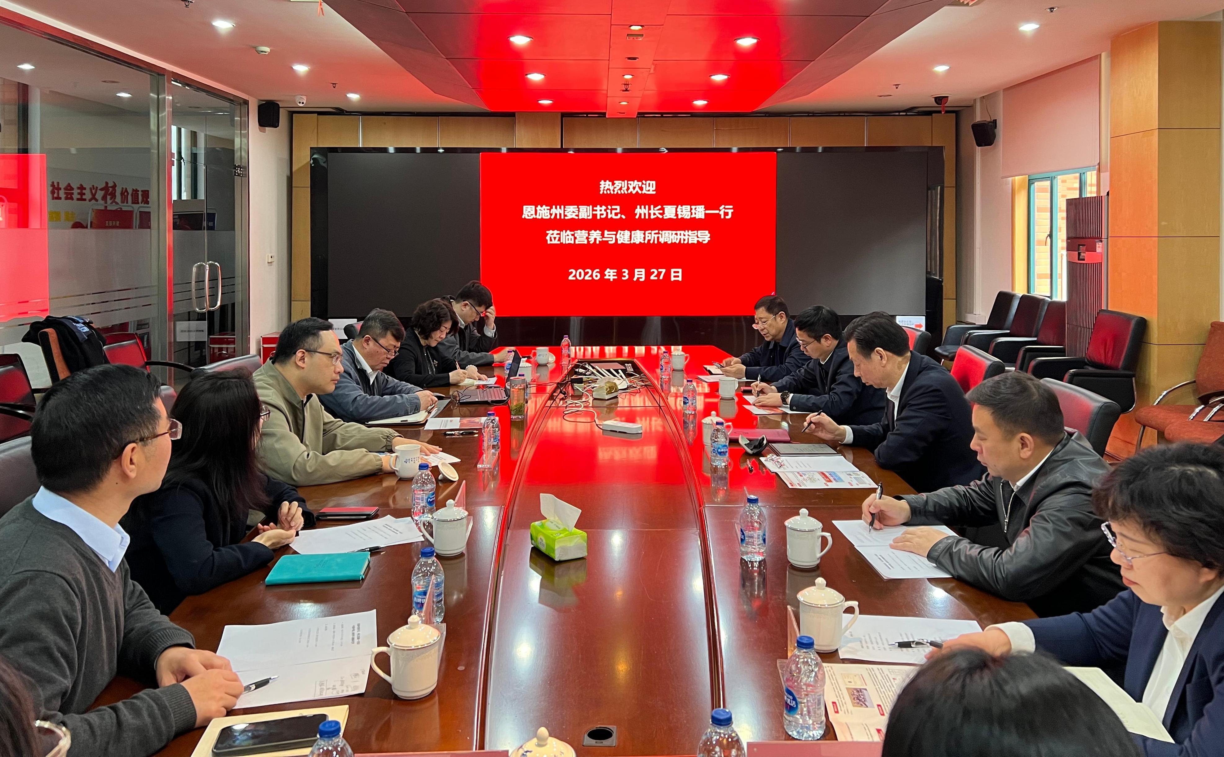 3月27日,湖北省恩施州委副书记、州长夏锡璠一行访问中国科学院上海营养与健康研究所。营养与健康所所长汪思佳研究员、项目总顾问蔡澎研究员、项目负责人丁秋蓉研究员等接待来宾。恩施高新区管委会、州招商中心、州驻长三角招商办事处、州科技局等部门领导陪同到访。会议听取了营养与健康所牵头,中国科学院上海有机化学研究所和中国科学院城市环境研究所等单位共同承担的恩施州“硒与健康”专项二期工作进展。